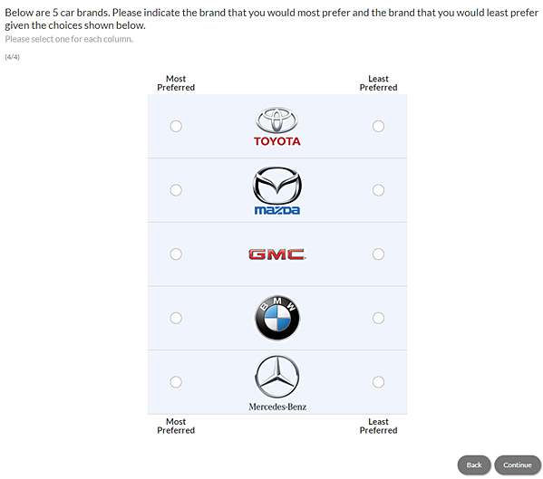 MaxDiff (Maximum Difference Scaling or Item Scaling)